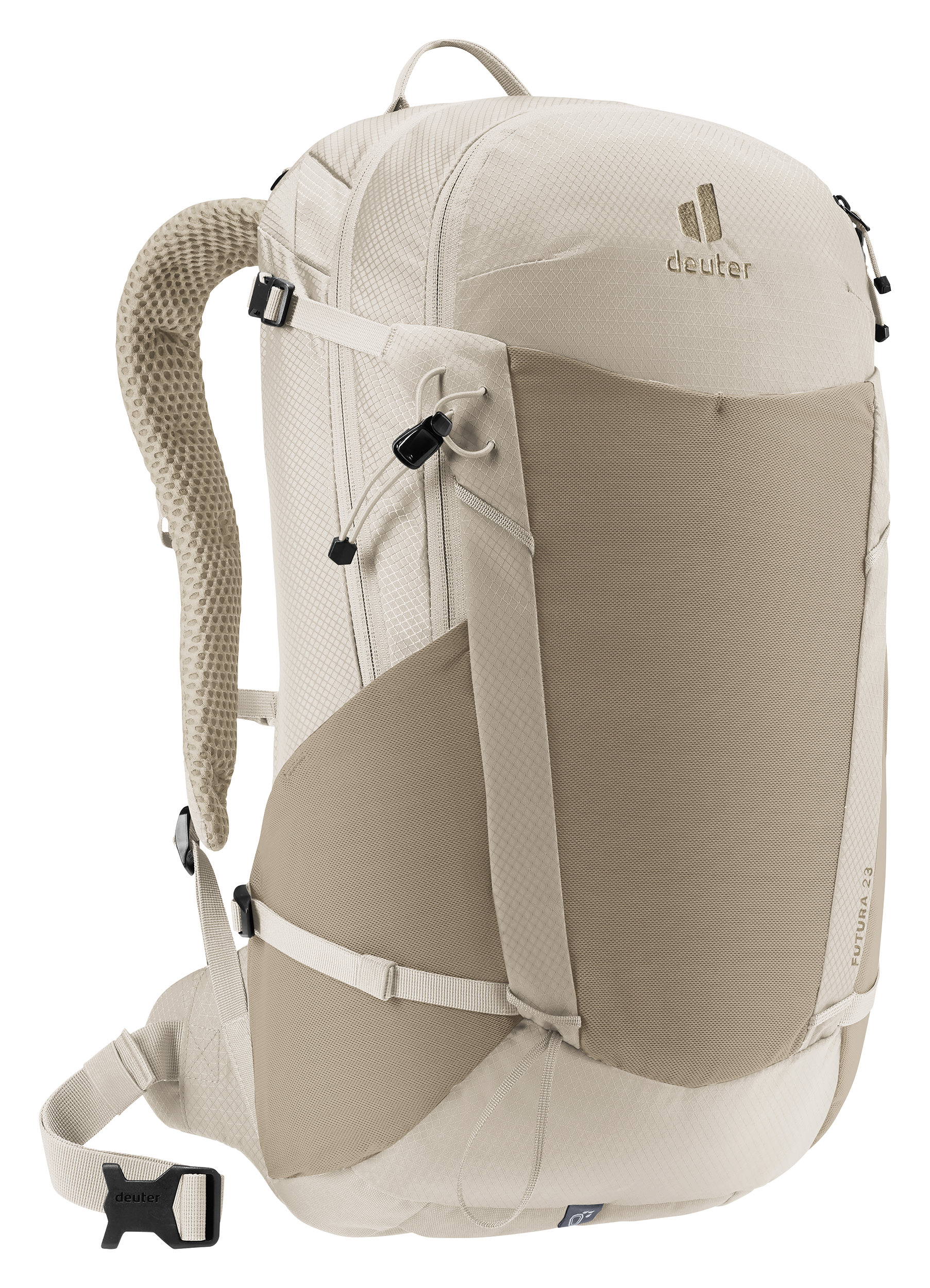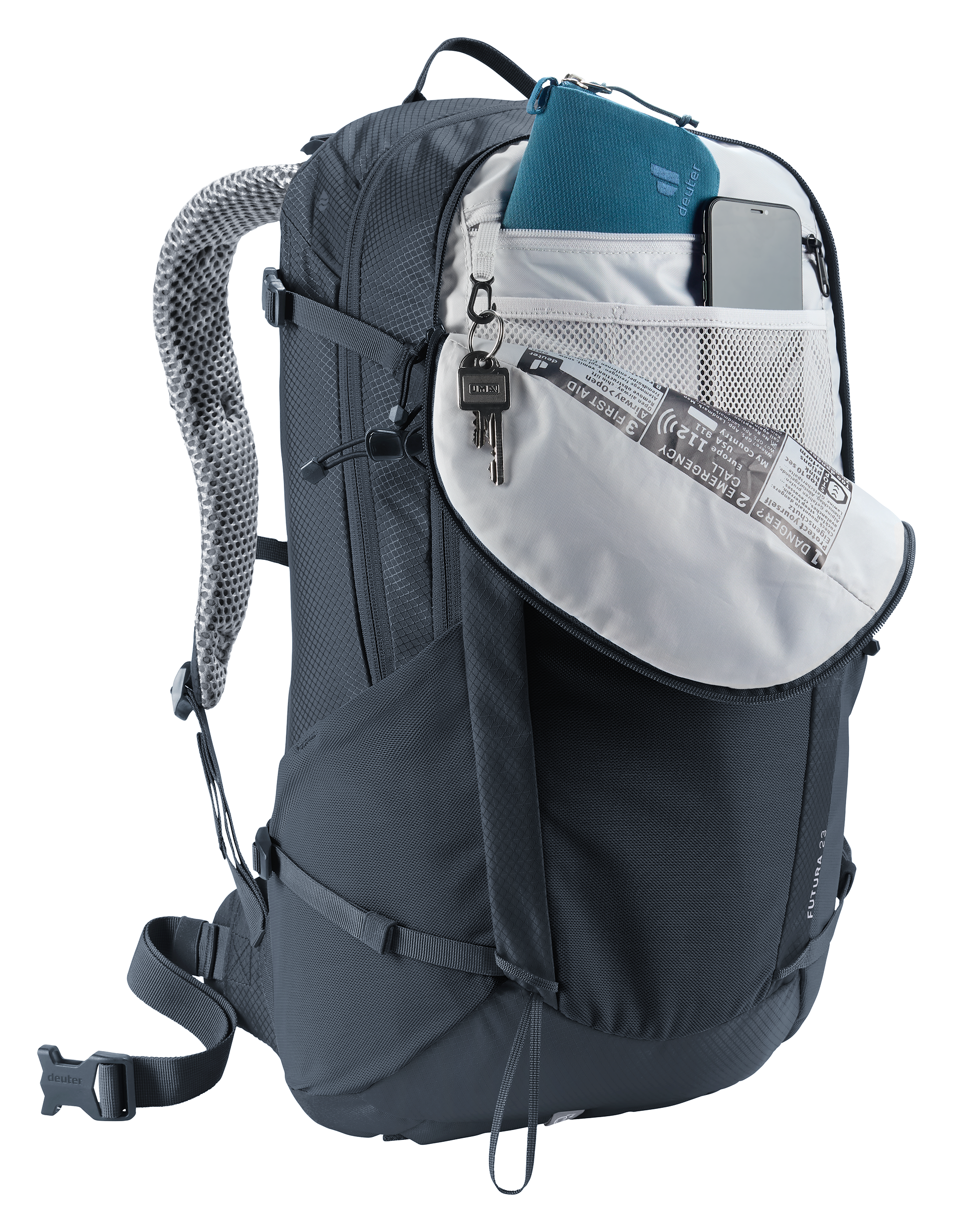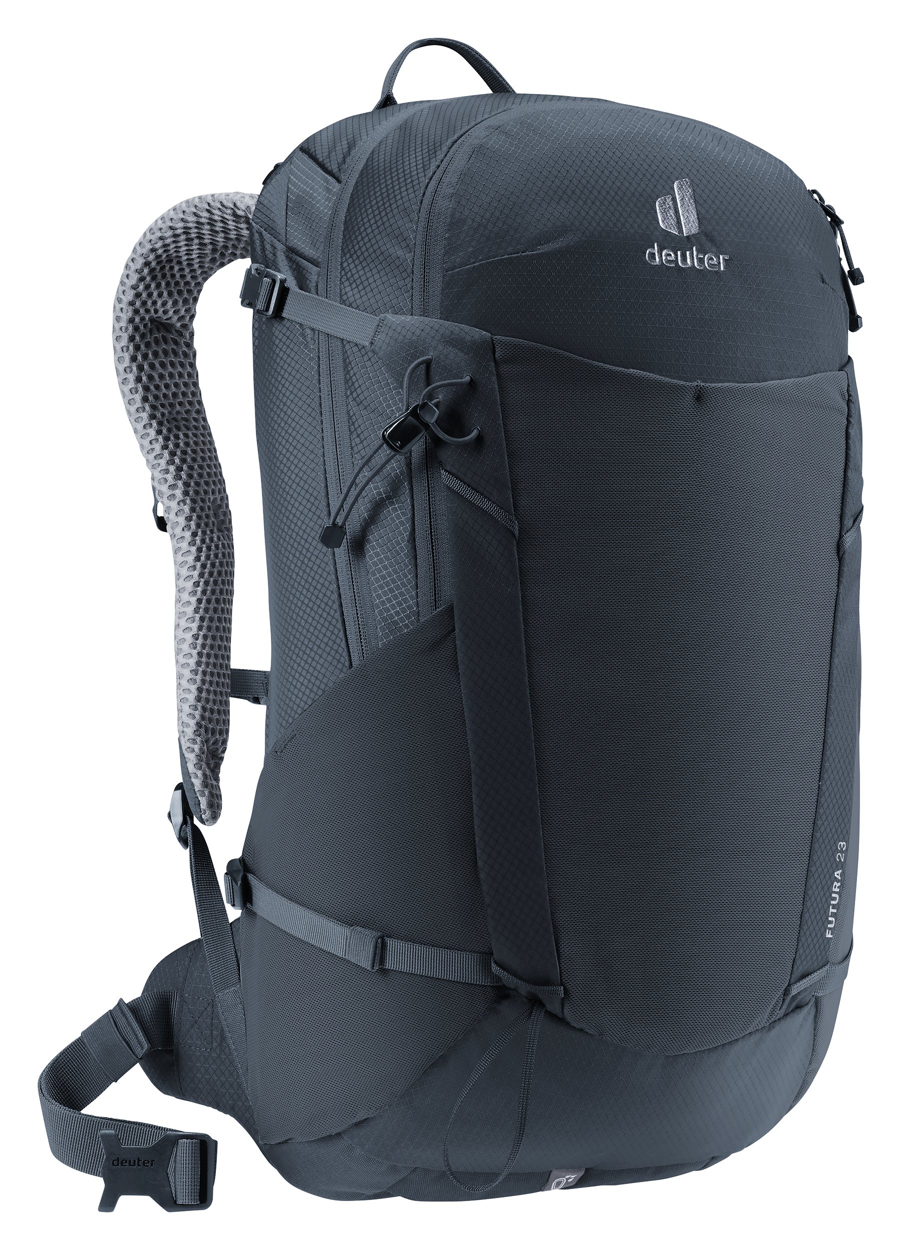Der Deuter Futura 23 kombiniert Leichtigkeit mit durchdachter Funktionalität. Das Aircomfort-Rückensystem sorgt zusammen mit ActiveFit-Schulterträgern und belüfteten Hüftflossen für eine ergonomische Gewichtsverlagerung und angenehme Luftzirkulation am Rücken.